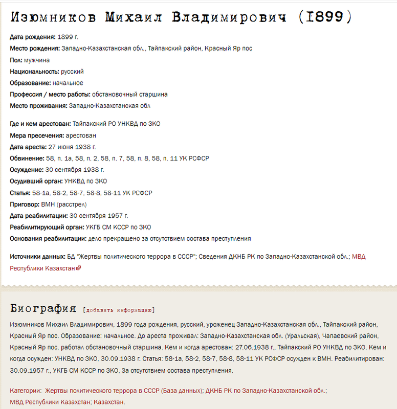 очень хочется узнать хоть что-то о своем деде Изюмникове Михаиле владимировиче .воевал в белой армии .потом в красной. в1938 был репрессирован. проживал он в тайпаке