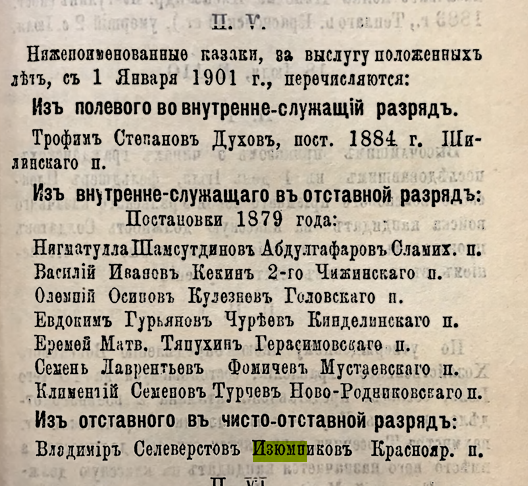 Изюмников Василий Яковлев казак 30 лет, 1693(4) года рождения (115об 1126 12 сотня 3 десяток). Дед и отец его родиною Нижегородского уезду, князя Михаила Яковлевича Черкасского, села Павлова, крестьяне. И с того села отец его пришел на Яик в 181 (1673) году. А он родился на Яике. Служит в казаках 12 лет. 1673 Изюмников Петр Васильев сын 20 недель, 1723(4) года рождения (115об 12 сотня 3 десяток)
