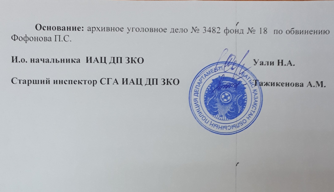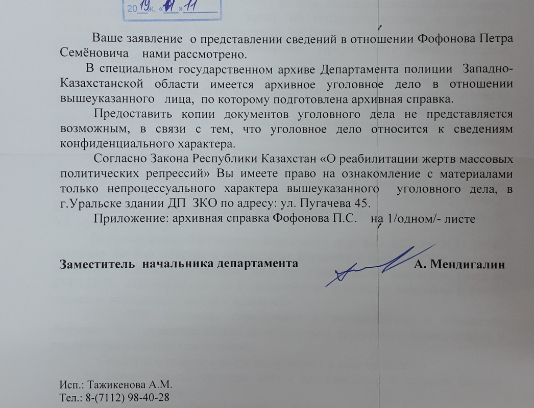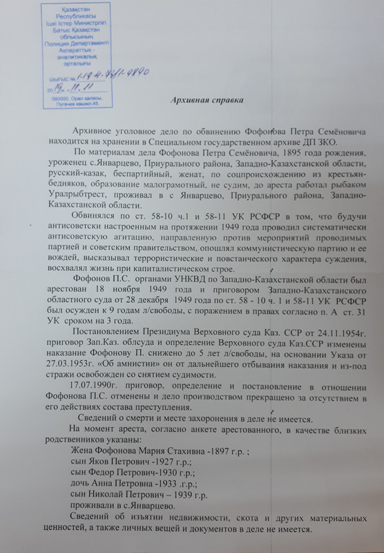 Здорово дневали, простите, что не писал долго, ждал ответ на письмо из ЗКО Уральска. Сегодня наконец-то пришло. Копию дела не предоставили, т.к. дело моего прадеда отностися к сведениям конфеденциального характера и предоставить они его не могут. Но в архивной справке указали года рождения всех членов семьи: Фофонов Пётр Семёнович -1895 г.р. жена Фофонова Мария Стахивна (так отчество записано в деле) -1897 г.р. сын Павел Петрович - 1922 г.р. сын Яков Петрович - 1927 г.р. сын Фёдор Петрович - 1930 г.р. дочь Анна Петровна - 1933 г.р. сын Николай Петрович - 1939 г.р. проживали в с. Январцево.