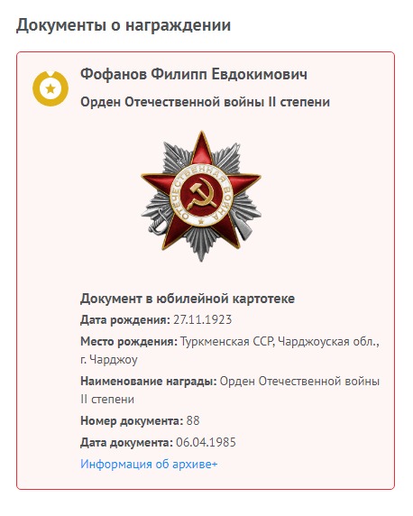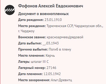 Здравствуйте! Я тоже ищу информацию про своих предков Фофоновых. Всё что мне известно на текущий момент, все они проживали в городе Чарджоу. Отец Евдоким Фофонов, сын Харитон Евдокимович Фофонов (1902-1983), сын Алексей Евдокимович Фофонов (1910-1943) погиб в плену, Филипп Евдокимович Фофонов.