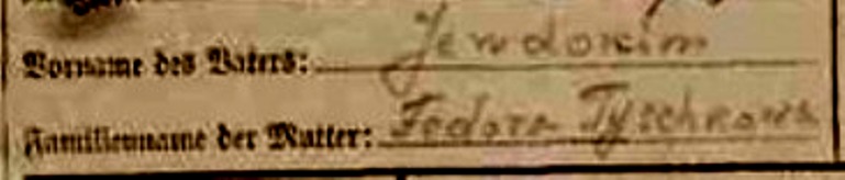 Могу ошибаться, но в немецкой карточке после имени (вероятно, отчество) Евдоким строчкой ниже записаны: Федот Тихон. Конечно, утверждать не берусь, но это может быть имя отца Евдокима. К сожалению, немецким языком не владею, поэтому не смог перевести названия строк в карточке.