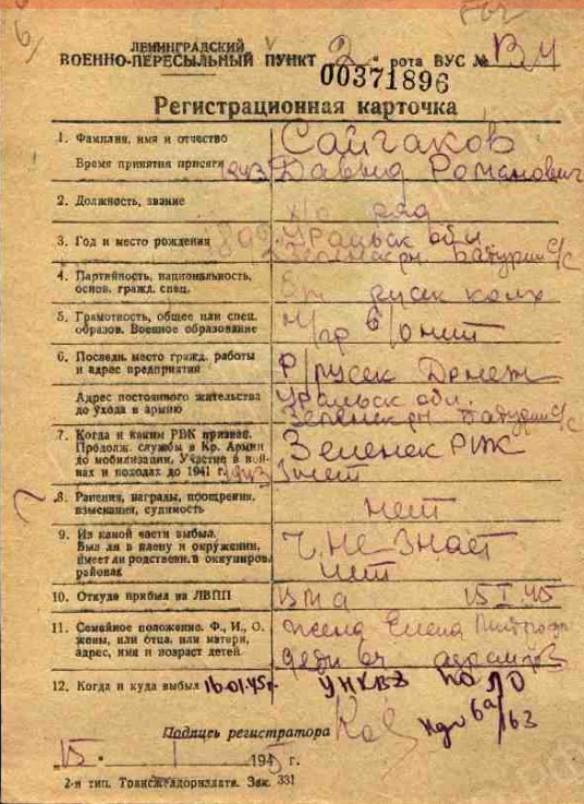 Сайгаков Давид Романович Картотека ранений Дата рождения: __.__.1892 Место рождения: Казахская ССР, Западно-Казахстанская обл., Зеленовский р-н Наименование военкомата: Уральский ГВК, Казахская ССР, Западно-Казахстанская обл., г. Уральск Дата и место призыва: Уральский ГВК, Казахская ССР, Западно-Казахстанская обл., г. Уральск Дата призыва: __.__.1943 Воинское звание: красноармеец Последнее место службы: в/ч 67793 Дата выбытия: 13.01.1945 Причина выбытия: выбыл из госпиталя Госпиталь: КГ ВМА КА им. Кирова Информация об архиве+