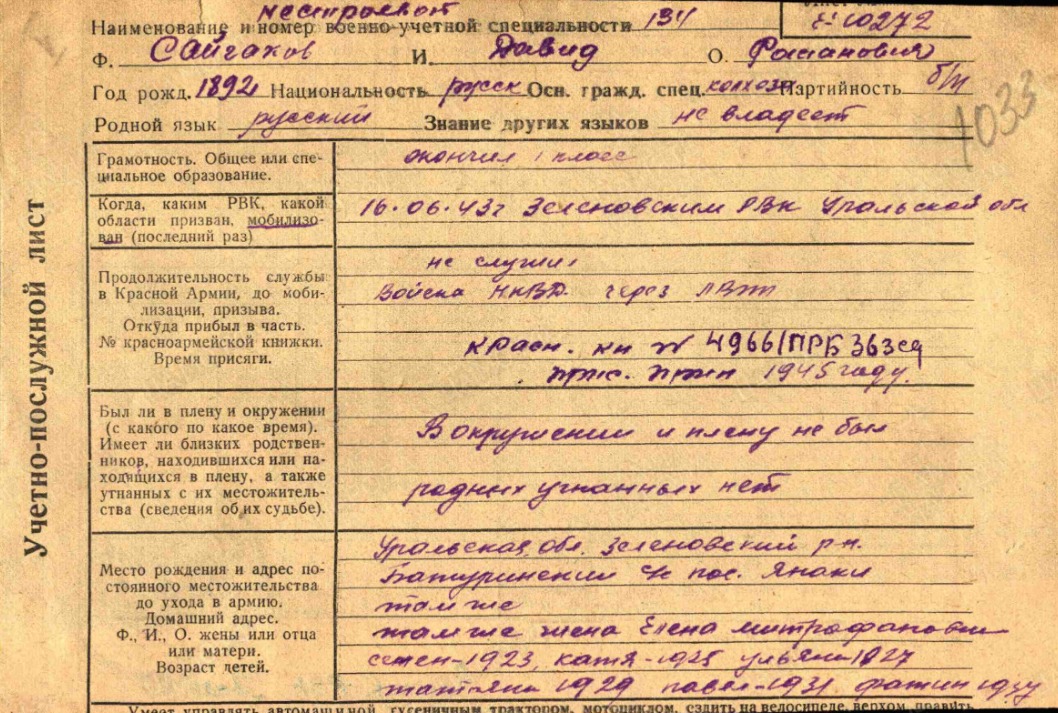 Сайгаков Давыд Романович(1892г-...) Информацию по уголовным делам можно получить в архиве ДВД З.К.О. Уральск ,ТАМ ХРАНЯТСЯ дела и можно ознакомится родственникам из газеты УВВ. 1890 28 22 июля 2 Сайгаков Петр Карпович казак внутренне-служащий увольняется по болезни в отставку пос.Янайкина от 16 июля 1890 г. № 456II Роман Карпович по приказу 1910 г. в чистую отставку отправлен.. 1910 - 51 = 1859 г.р.