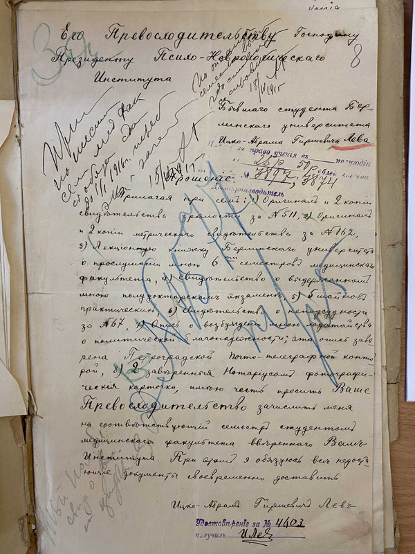 Из того, что узнала в архиве я - учился он в Петрограде, ранее (говорят те родственники) учился в Берлине, недоучился, вернулся в Россию... (подтверждения этим данным - упоминание что при поступлении в институ он приложил книжку Берлинского университета медицинского о прохождении там 6 семестров обучения))