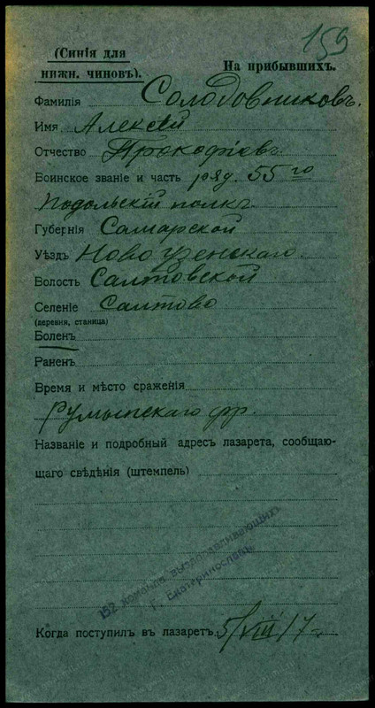 Место рождения Уральская обл., Уральский уезд, Херсонская станица, п. Январцевский Причина выбытия ранен/контужен