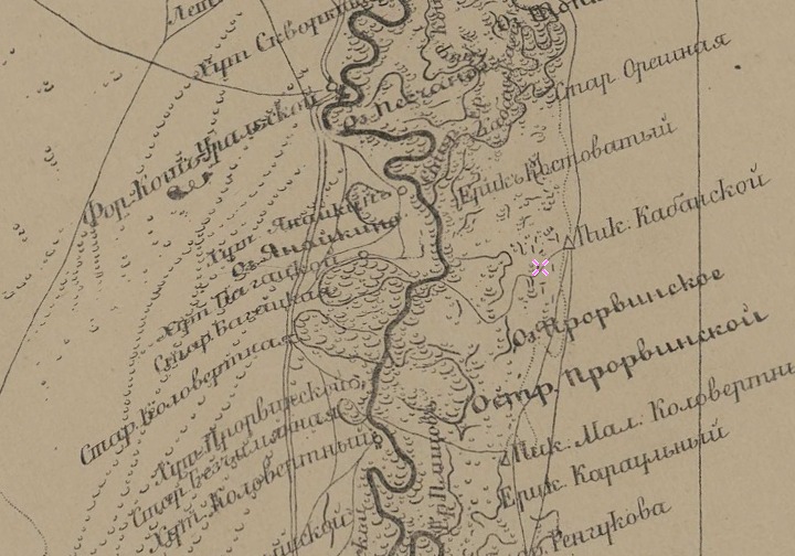 а это Кош Уральск (Яик ) вверху я поставил метку.Он стоит на материковой части,В своё время Урал отрезал перемычку и Кош Яик стал островом и пришлось казакам переселится в во второй половине 19 века в Янайкино.