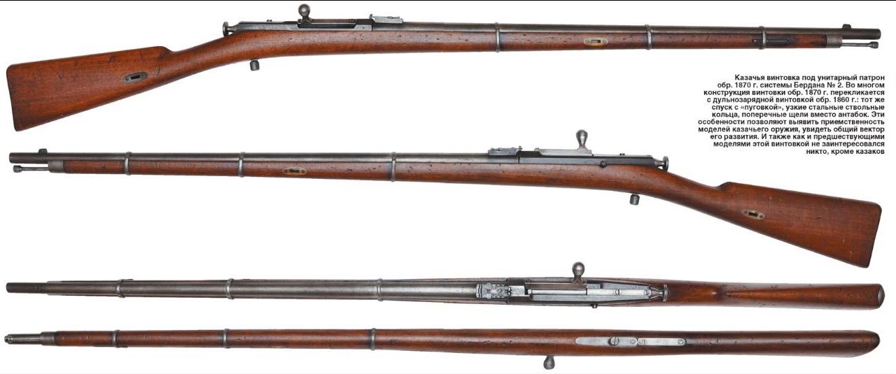 В интернете пишут, что казаки использовали: 1) винтовку А.Б. Чернолихова — имела узкий приклад, прицел из трёх щитков и «восточный» спуск в виде пуговицы; 2) казачью винтовку, являющуюся вариантом пехотной винтовки Бердана №2, выполненной в «азиатском» стиле; 3) казачью винтовку Мосина образца 1891 года. Штык отсутствовал, а на казённой части винтовки было выбито «каз» (казачья).